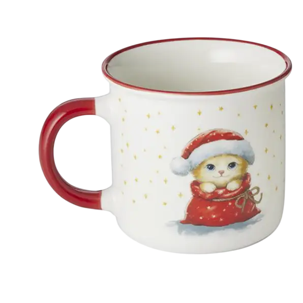 La tasse est en New Bone China, une porcelaine connue pour sa qualité. Elle est décorée d’un chat incroyablement mignon portant un chapeau de Père Noël et sortant d’un sac rouge.