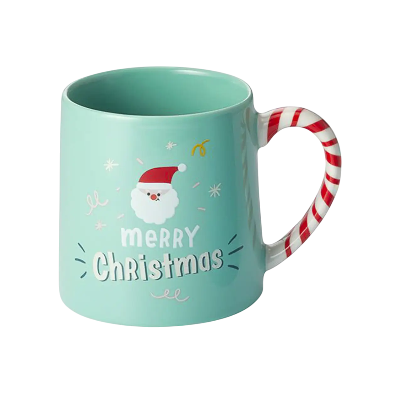 La tasse est en New Bone China, une porcelaine connue pour sa qualité et peinte à la main. Elle est bleu-vert, l’anse couleur sucre d’orge décorée d’un petit Père Noël qui vous souhaite un « Merry Christmas »