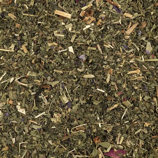 Feuilles d’ortie, menthe nanah, feuilles de menthe poivrée, avoine vert sans gluten, écorces de cynorrhodon, fenouil, solidage géant, feuilles de mauve, pissenlit, arôme naturel, fleurs de mauve, pétales de rose.