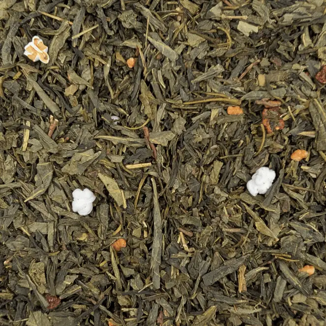 Thé vert du Japon : Sencha, Bancha, Genmaicha (thé, riz), Kukicha. Arôme, morceaux de fraise, groseilles.