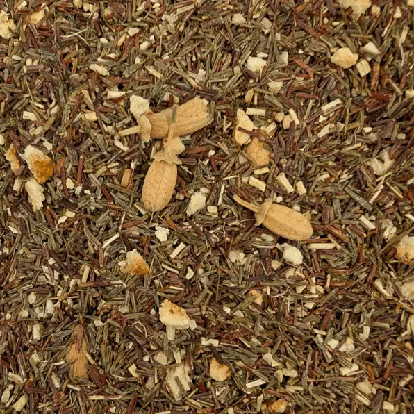 Rooibos vert, écorces d’orange, morceaux de gingembre, fleurs d’oranger.