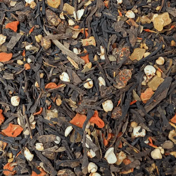 Thé vert torréfié Black Sencha, morceaux d’abricots (apricot, farine de riz), morceaux de gingembre, flocons de carotte, sarrasin soufflé, arôme, sarrasin grillé, poivre, cardamome, feuilles de mûre douce, carthame.
