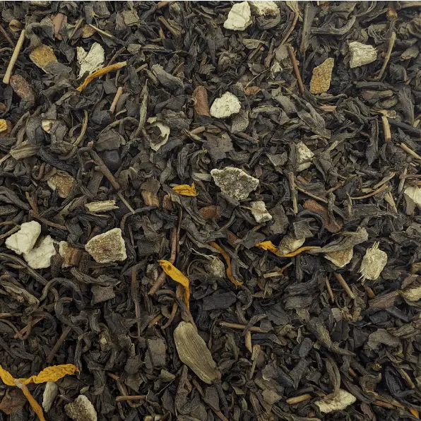 Thé vert de Chine Ming Mee*, cannelle*, écorces d’orange*, morceaux de gingembre*, arôme naturel d’agrumes, morceaux de fruit de la passion (purée de pomme concentrée*, fruit de la passion concentré*, antioxydants), clous de girofle*, cardamome*, fleurs de tournesol*, poivre noir*.