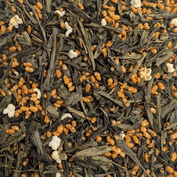 Thé vert genmaicha au riz soufflé et parfumé à la pêche et à l’amande.