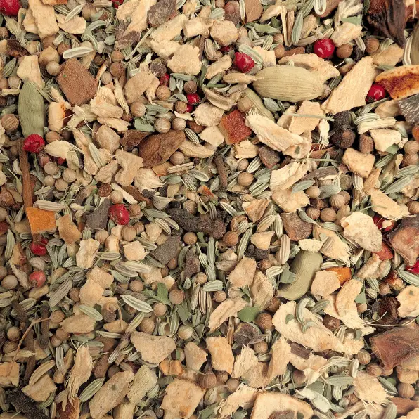 Fenouil, morceaux de gingembre, coriandre, cannelle, réglisse, écorces d’orange, anis étoilé, feuilles de moringa, clou de girofle, poivre rose, cardamome, poivre noir.