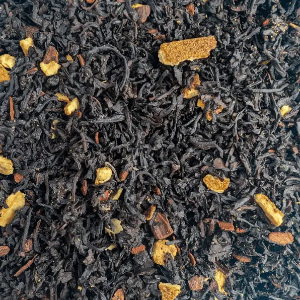 Thés noirs Assam* et Inde du Sud*, caramel*, bâtons de cannelle*, écorces d’orange*, huile essentielle de citron vert*, arôme naturel d’orange, muscade*, coriandre moulue*, arôme naturel de cannelle, extrait de vanille*, vanille*.