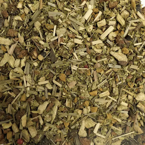 Morceaux de gingembre*, morceaux de pomme* (pomme, acidifiant : acide citrique), curcuma*, feuilles de moringa*, cannelle*, racine de réglisse*, citronnelle*, fenouil*, arôme naturel de fruits, d’agrumes et d’épices, huile essentielle de citron*, poivre rose*, racine de ginseng*.